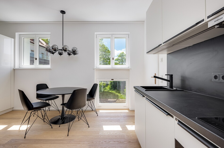 Haus Mühlbach zeigt, wie sensibel und kraftvoll zugleich Architektur Geschichte weiterschreiben kann. Die historische Substanz – mit barockisierender Fassade, Bossenstrukturen und feinen Gesimselementen – wurde detailverliebt restauriert. Neue Gebäudeteile fügen sich mit klarer Linienführung, großen Fensterflächen und unaufdringlicher Eleganz in das Ensemble ein. Innen trifft handwerkliche Qualität auf moderne Gestaltung: ausgewählte Materialien, farblich fein abgestimmte Oberflächen und charmante Details schaffen ein Wohnerlebnis zwischen Zeitgeist und Tradition.