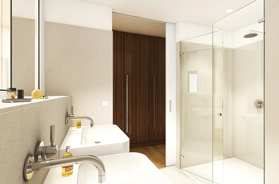 Die Ausstattung des Hauses erfüllt höchste Ansprüche an Funktionalität, Komfort und Design. In den Wohnungen sorgt naturgeöltes Eichenparkett in »englischem Verband« für warme Eleganz, ergänzt durch Fußbodenheizung in allen Aufenthaltsräumen. Die Bäder sind mit Designarmaturen von Hansgrohe und Dornbracht, Sanitärkeramik von Duravit und Viega-Elementen ausgestattet. Alle Wohnungen verfügen über bodentiefe Aluminiumfenster, elektrisch gesteuerte Stoffmarkisen, Video-Gegensprechanlage und hochwertig ausgebaute Außenflächen – von WPC-Balkonbelägen bis zu großzügigen Dachterrassen mit Naturstein.