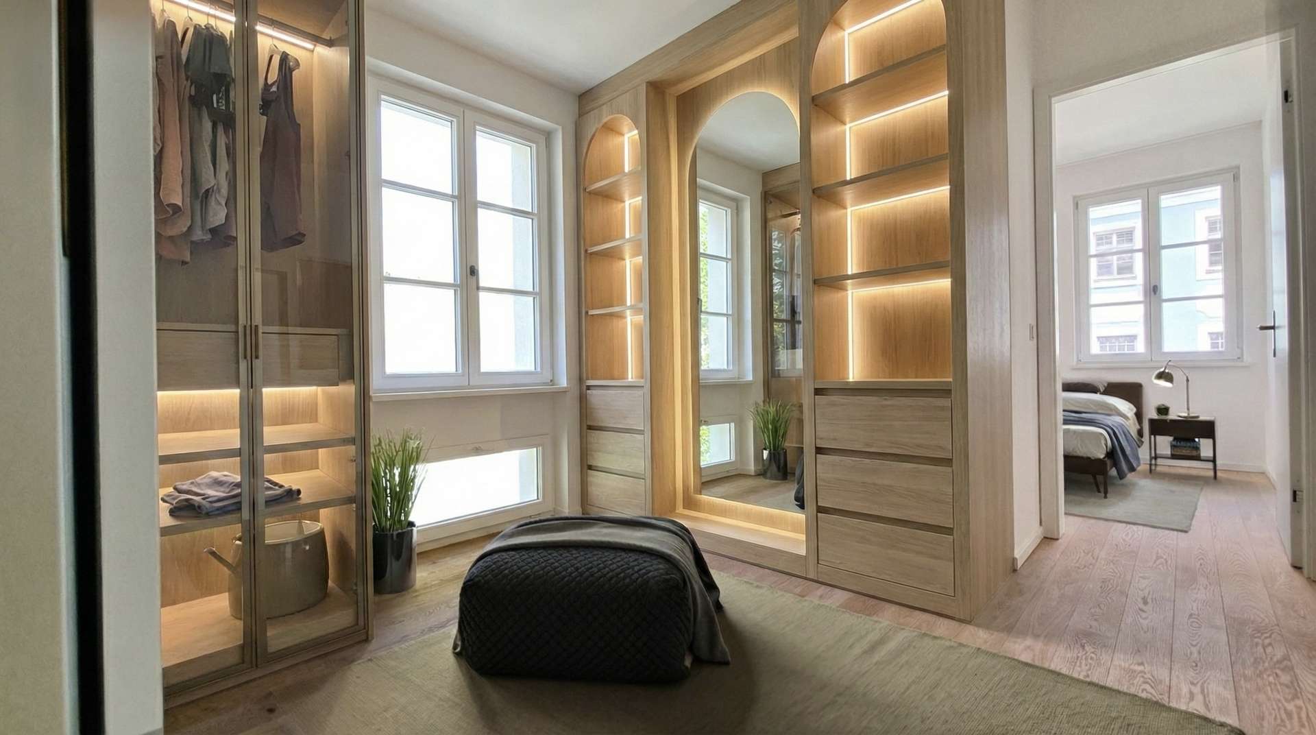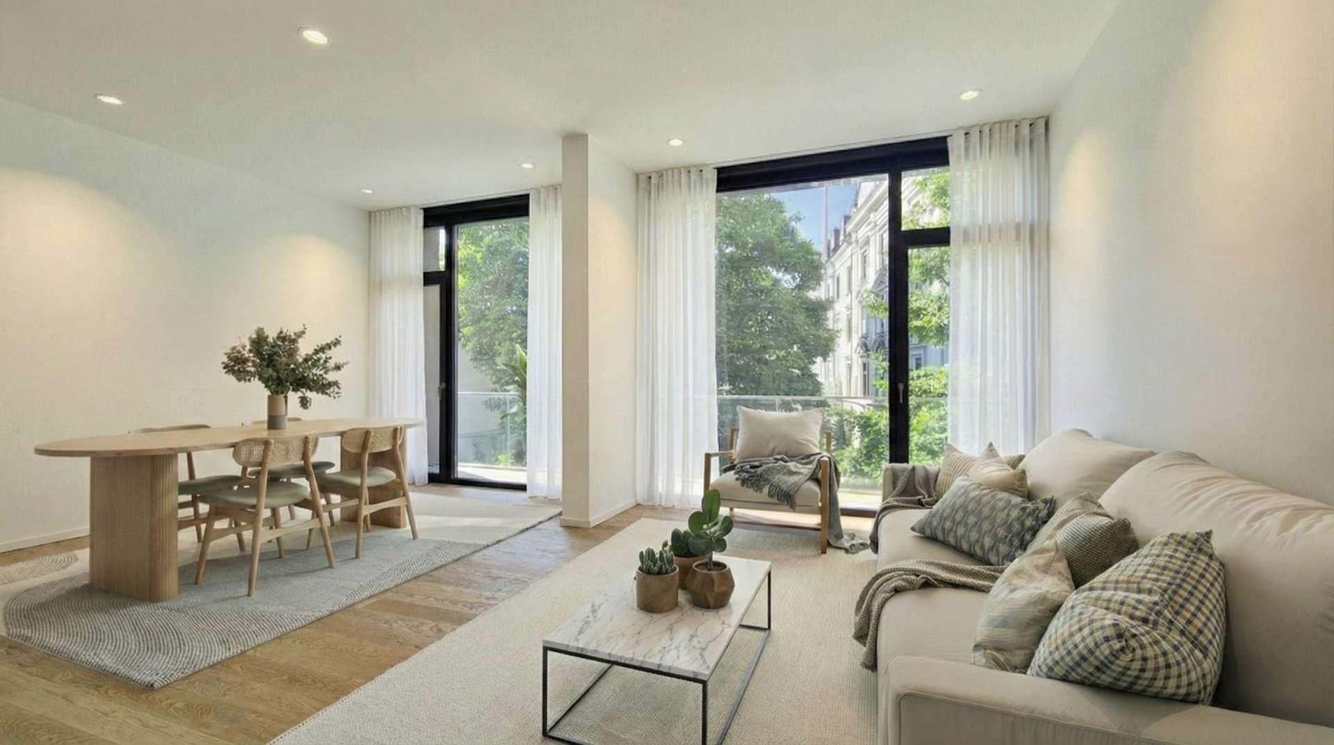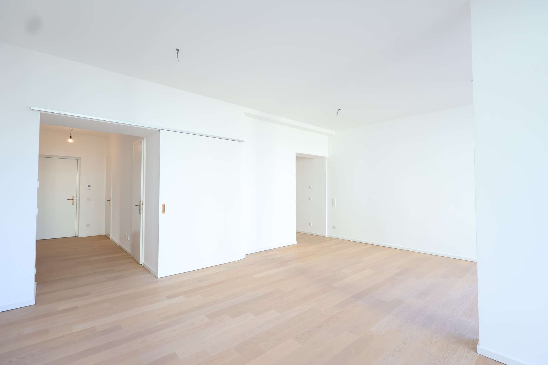 Auf ca. 90,6 m² erwarten Sie ein beeindruckender, rund 30 m² großer Wohn-/Essbereich mit bodentiefer Verglasung und Balkon, eine separate, hochwertig ausgestattete Küche, zwei ruhige Schlafzimmer sowie ein flexibel nutzbares Durchgangszimmer (z. B. Arbeiten oder Ankleide). Zwei vollwertige Duschbäder, edle Eichendielen in den Wohnräumen, Feinsteinzeug in den Bädern und eine Fußbodenheizung mit Einzelraumsteuerung unterstreichen den hohen Ausstattungsstandard.