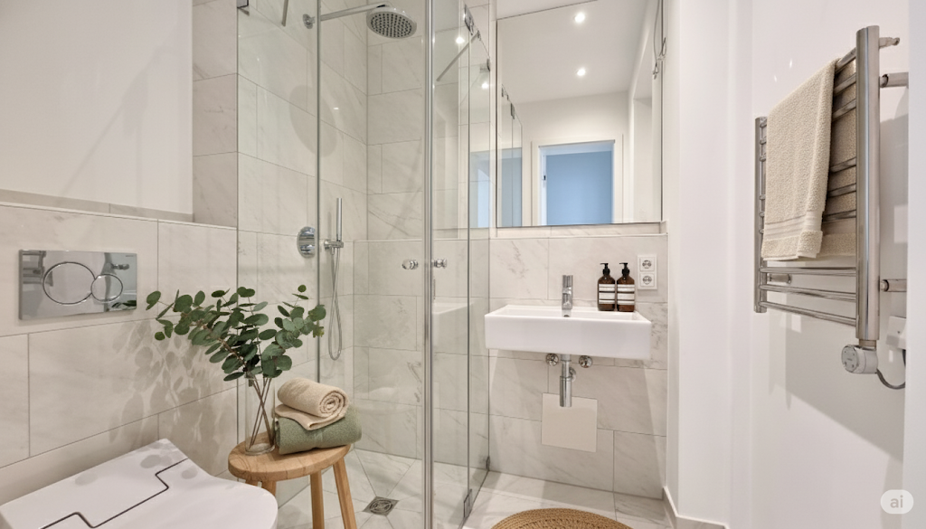 - Edles Eichendielenparkett, Feinsteinzeug in den Bädern