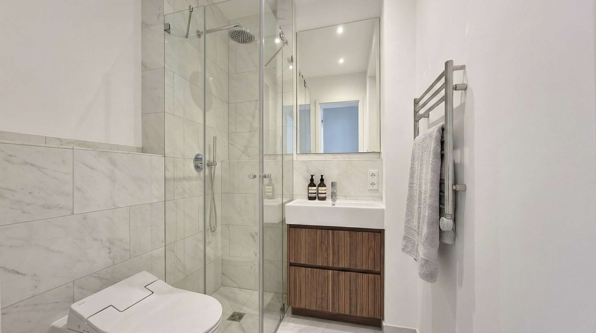 - Zwei vollwertige Duschbäder mit bodengleichen Duschen, Duravit & Dornbracht