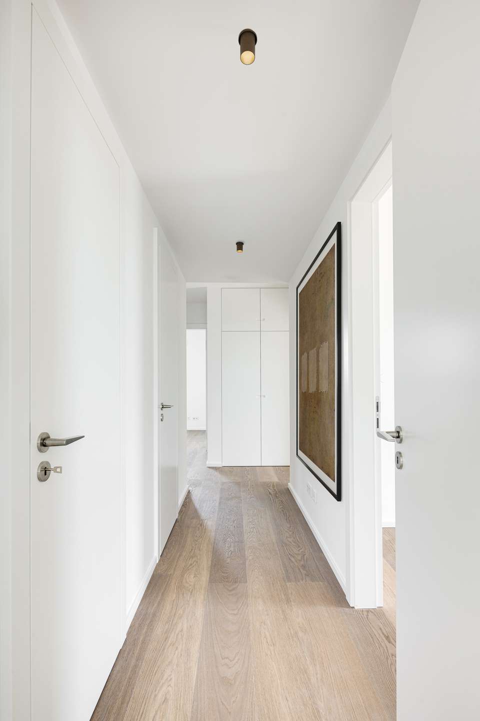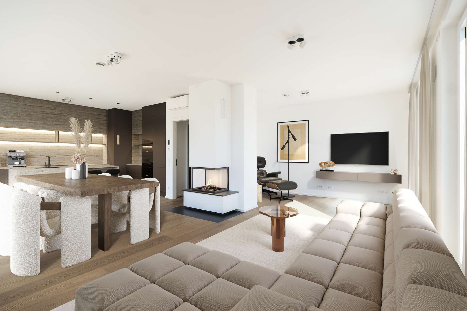 Die Ausstattung dieses Penthouses lässt keine Wünsche offen: Edle Eichendielen und Fußbodenheizung sorgen für ein behagliches Wohngefühl. Bodentiefe Holz-Aluminium-Fenster mit elektrischen Sonnenschutz-Screens, eine Multi-Split-Klimaanlage sowie KNX-Bus-Vorbereitung bieten modernen Komfort. Für entspannte Abende ist ein Kaminzug im offenen Wohn-/Essbereich vorhanden. Ein direkter Aufzug zur Wohnung, barrierearmer Zugang und ein Tiefgaragenstellplatz mit E-Lade-Vorrüstung runden das exklusive Gesamtpaket ab.