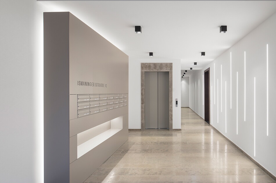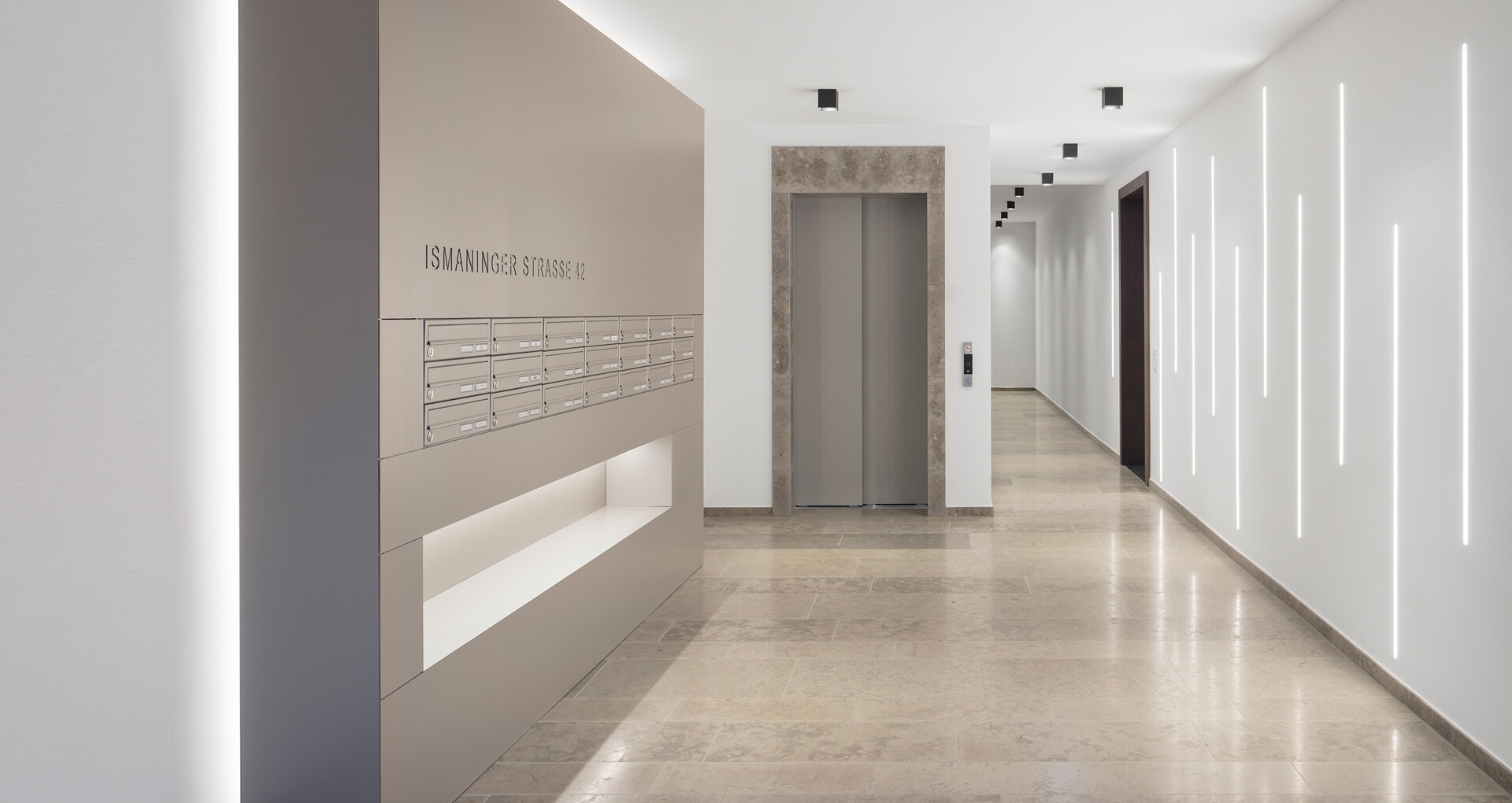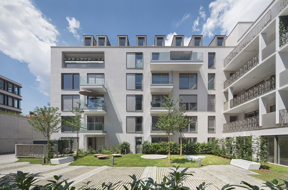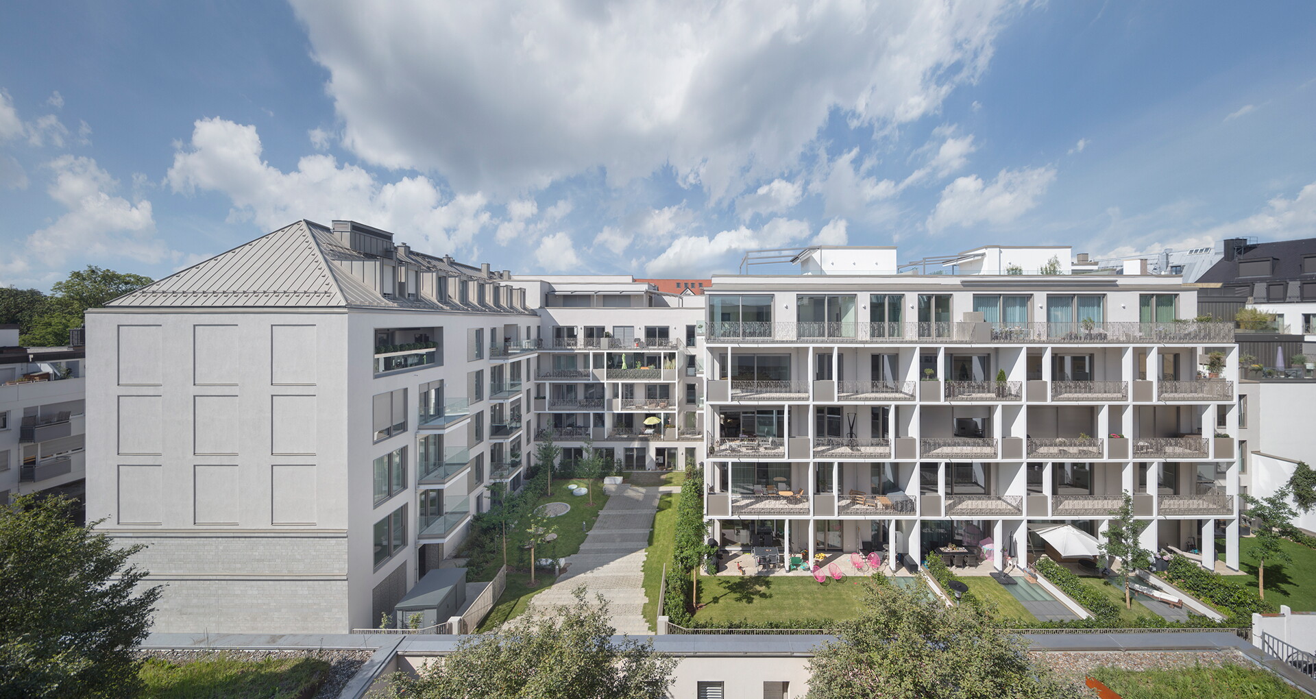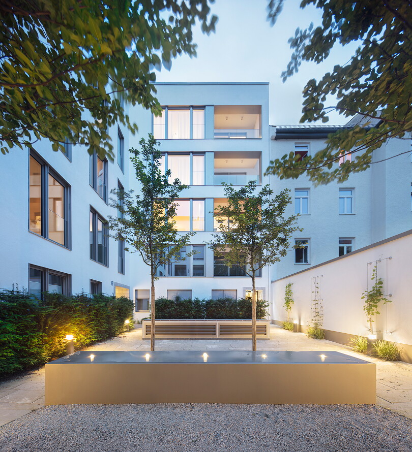 Die Troger Höfe stehen für eine zeitgenössische Interpretation urbaner Eleganz im historischen Kontext. Entworfen von Landau + Kindelbacher, verbindet das Ensemble Natursteinfassaden, klare Linien und klassische Proportionen mit modernen Elementen wie großflächigen Fensterfronten, Glas-Schiebeelementen und großzügigen Freiflächen. Zur Straße hin traditionell eingebettet, öffnet sich das Gebäude rückseitig in begrünte Innenhöfe mit Wasserspiel, Sitzinseln und Privatgärten – eine harmonische Architektur zwischen Rückzug und Repräsentanz.