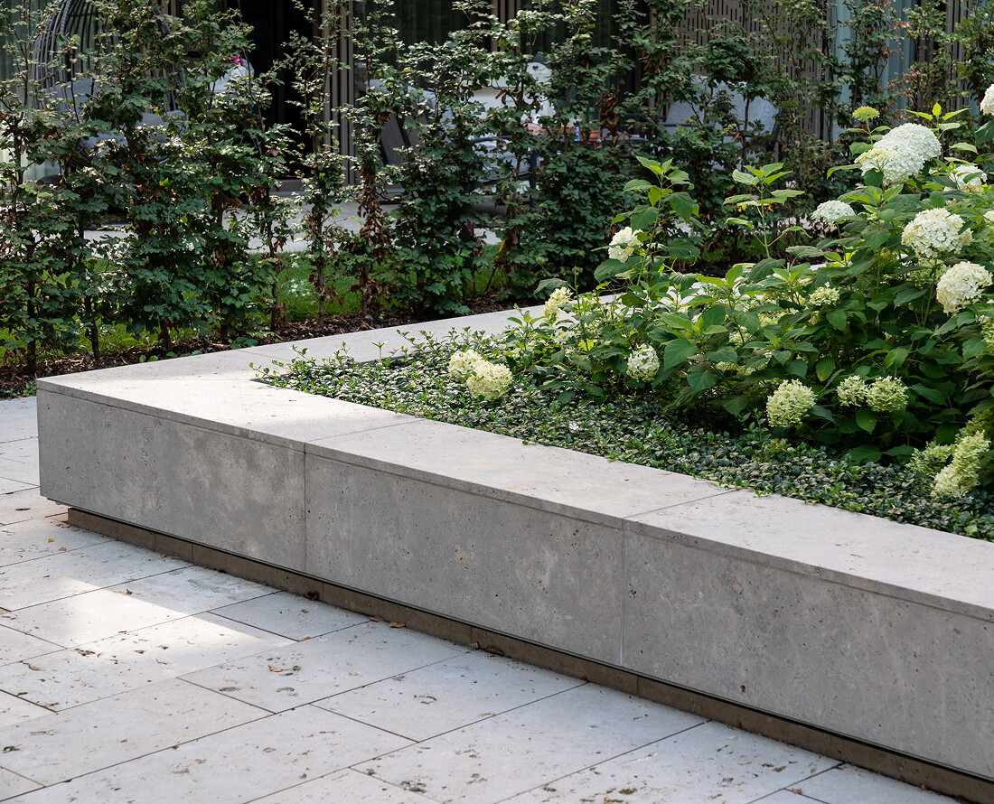 - Natursteinbäder mit Pietra Piasentina und bodengleichen Duschen